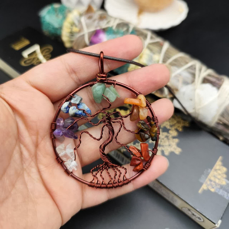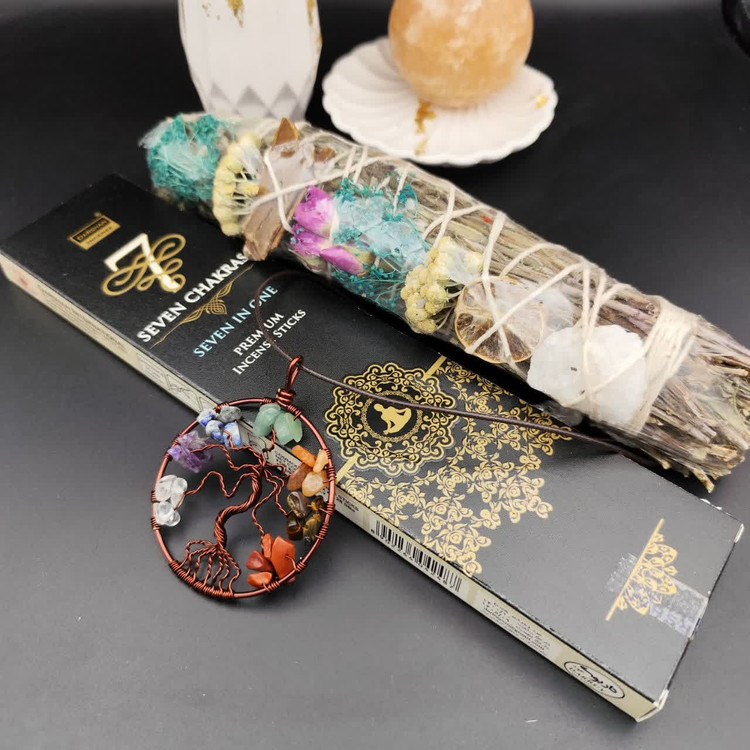 پک چهار عددی گردنبند درخت زندگی هفت چاکرا ، عود هفت چاکرا ، بند چرم و اسماج