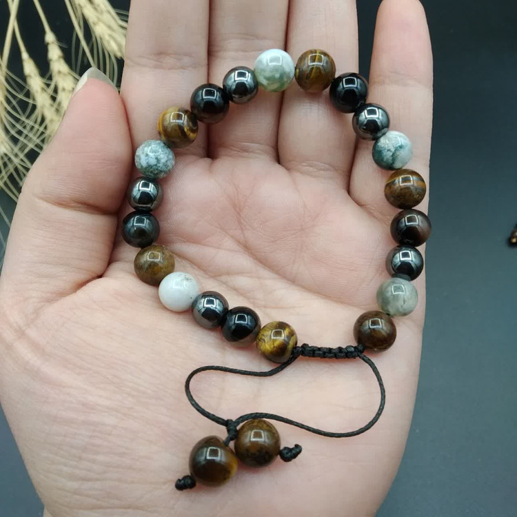دستبند حدید ، عقیق ، عقیق شجر خزه و چشم ببر اصل معدنی کد 8958