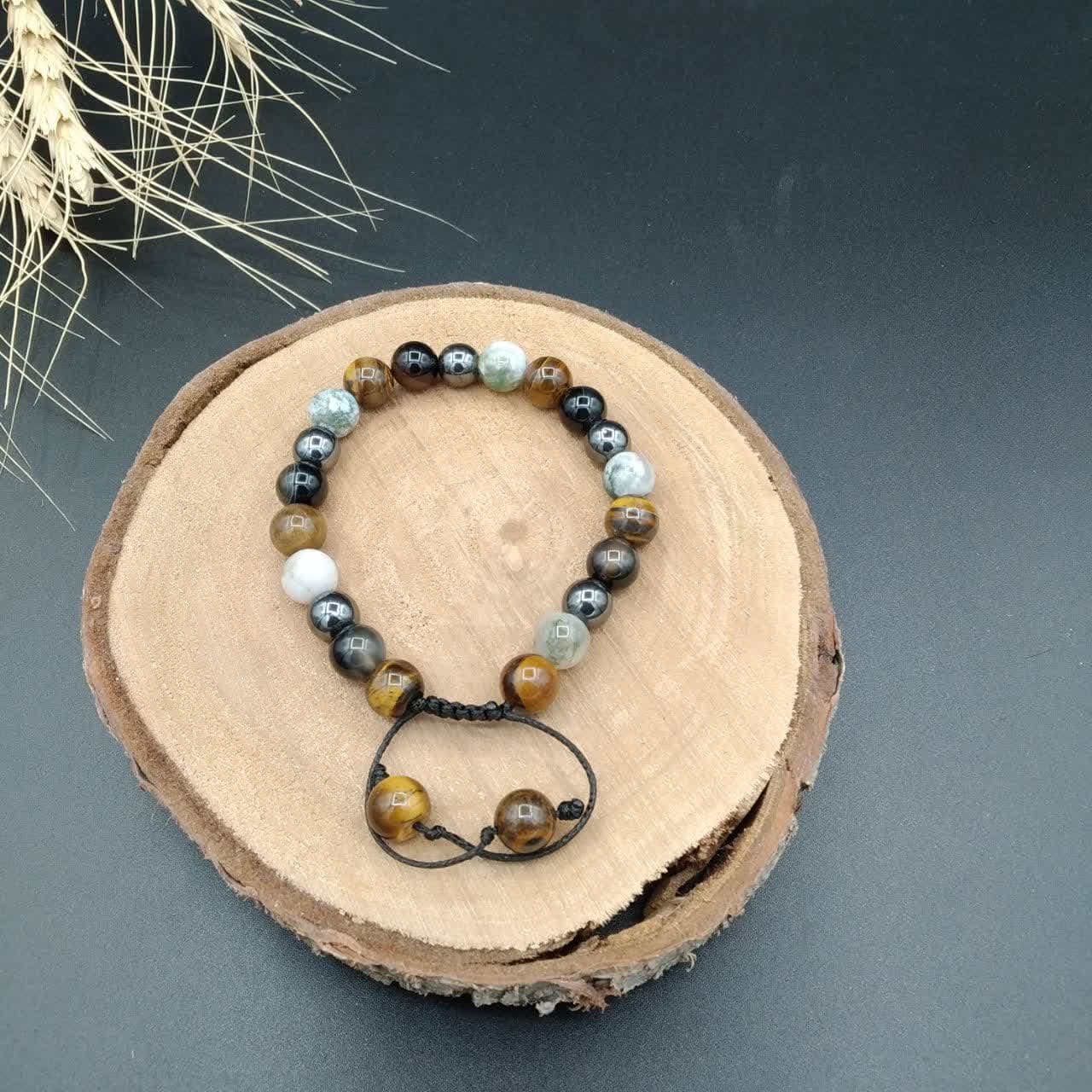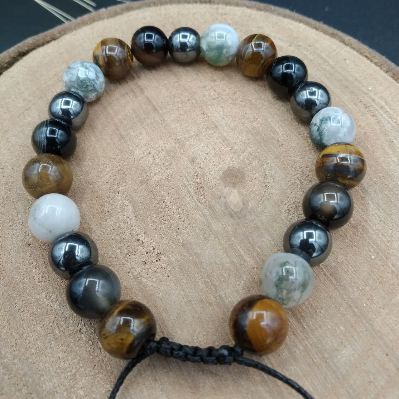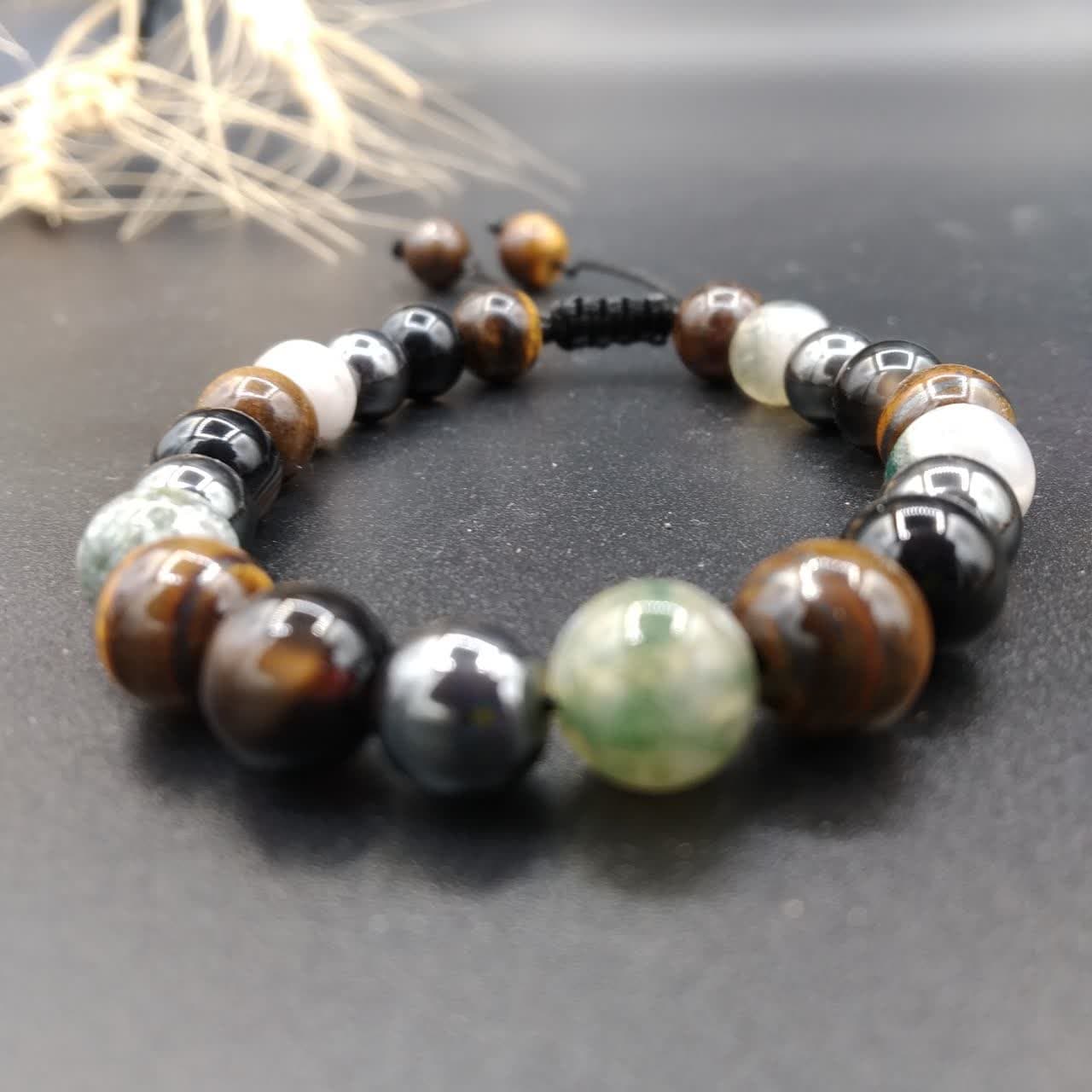 دستبند حدید ، عقیق ، عقیق شجر خزه و چشم ببر اصل معدنی کد 8958