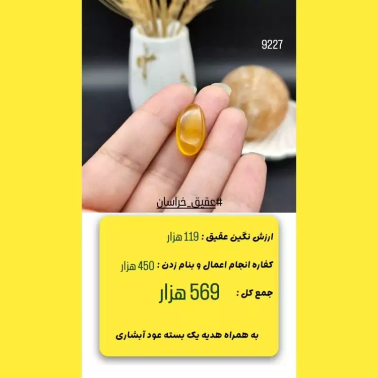 نکته : انجام اعمال روز 19 فروردین است و ارسال کارهای عقیق با دعای شرف الشمش 23 فروردین انجام میشود . ⭕️ ارزش این کار بی نظیر فقط و فقط 119/900 هزار تومان⭕️ . ⭕️ کفاره انجام اعمال و بنام زدن این کار بی نظیر فقط و فقط 450 هزار تومان⭕️ . 📏 ابعاد : 19.5*10.9 میلیمتر . 🟪 رنگ : زرد . 💢 هر خرید = یک هدیه . ♦️تمامی سنگها به همراه باکس هدیه تقدیم میشوند