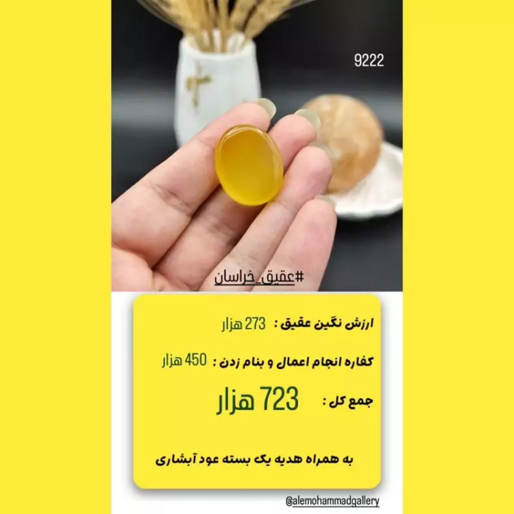 نکته : انجام اعمال روز 19 فروردین است و ارسال کارهای عقیق با دعای شرف الشمش 23 فروردین انجام میشود . ⭕️ ارزش این کار بی نظیر فقط و فقط 273/200 هزار تومان⭕️ . ⭕️ کفاره انجام اعمال و بنام زدن این کار بی نظیر فقط و فقط 450 هزار تومان⭕️ . 📏 ابعاد : 24.1*19.1 میلیمتر . 🟪 رنگ : زرد . 💢 هر خرید = یک هدیه . ♦️تمامی سنگها به همراه باکس هدیه تقدیم میشوند
