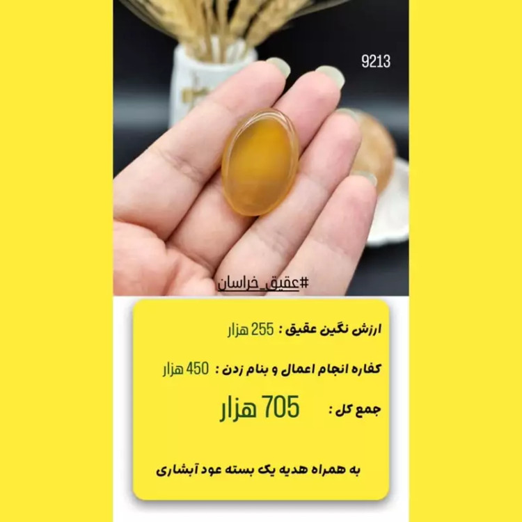 نگین عقیق زرد خراسان اصل معدنی مزین به دعای شرف الشمس ( رزق و روزی ) کد 9213
