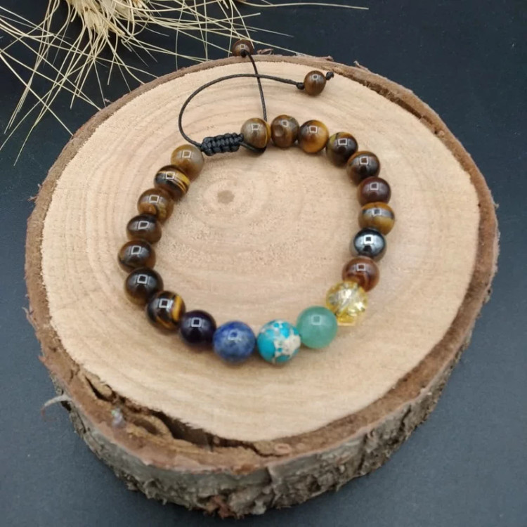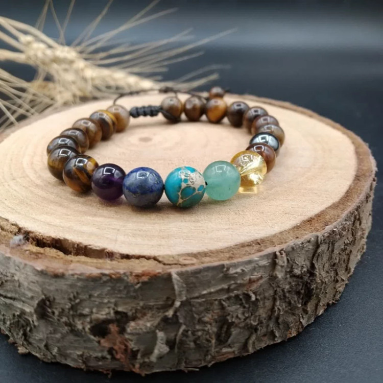 دستبند هفت سنگ اصل معدنی ساخته شده از مهره های چشم ببر ، سیترین ، حدید ، اونتورین ،فیروزه ، لاجورد ، امیتیست و عقیق