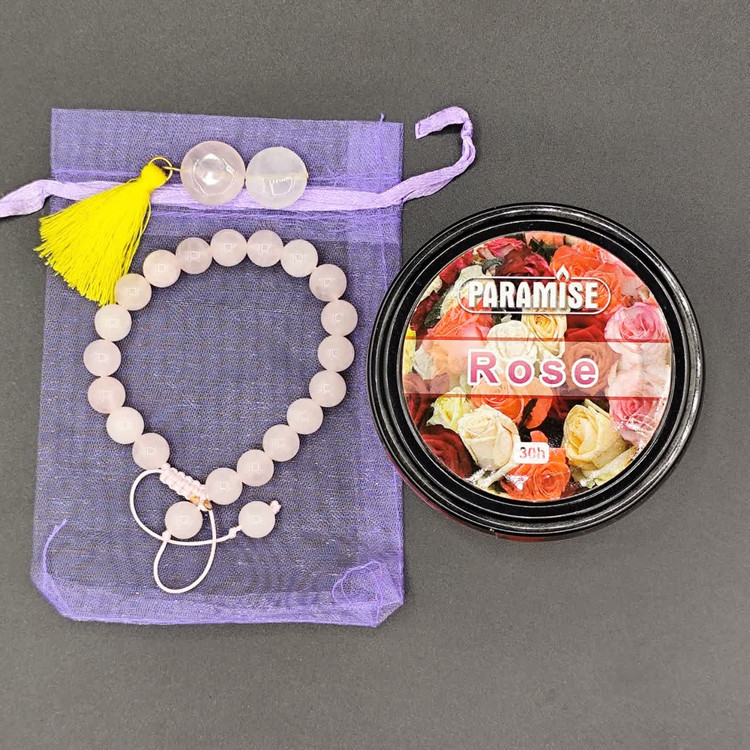 سکه عشق سنگ رزکوارتز ، دستبند رزکواراز ، شمع رز 30 ساعت سوخت ، کیسه نگهدارنده